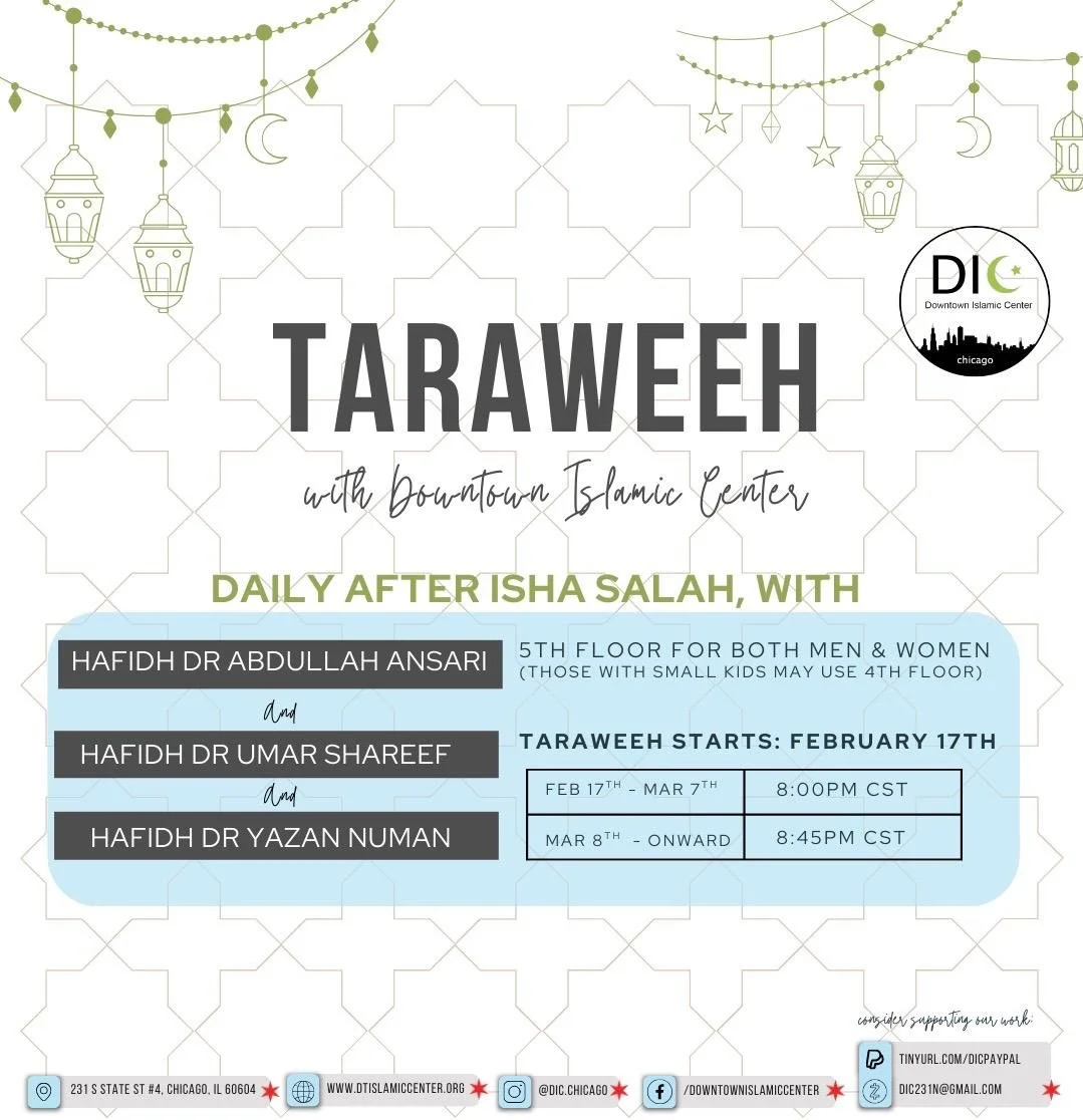This Ramadan, Downtown Islamic Center (DIC) is pleased to present a wide range of programs designed to serve our diverse downtown Chicago community. We look forward to a meaningful and rewarding experience through thoughtfully curated events for all members of our community.